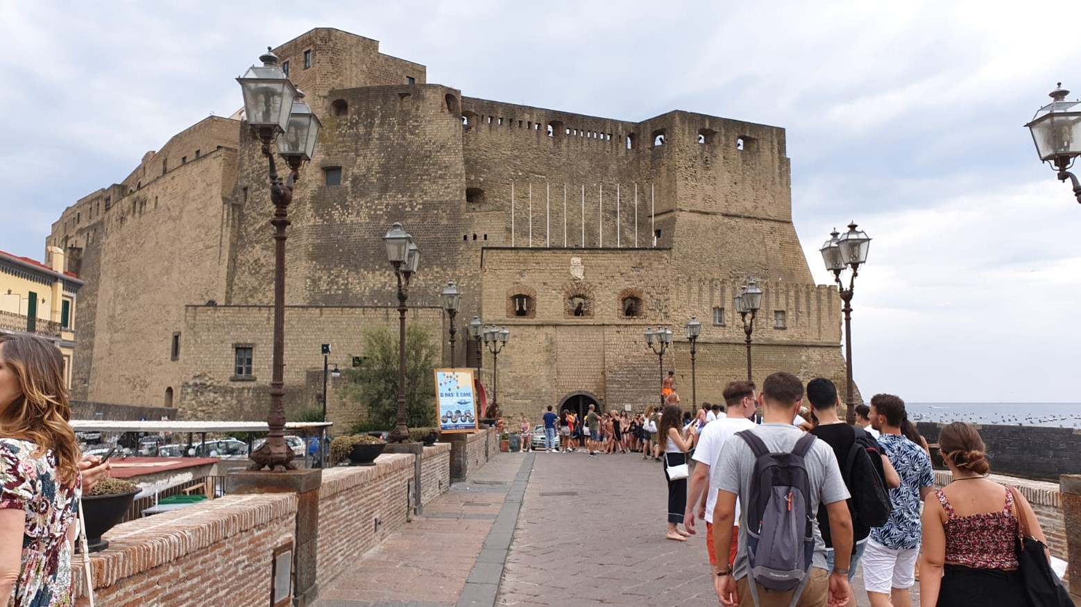 En me promenant sur le Lungomare Caracciolo, les yeux ravis par le golfe de Naples et, en arrière-plan, le Vésuve, on perd la notion du temps mais pas l'appétit. Après une pizza pour satisfaire le palais, je poursuis la promenade jusqu'à un pont au pavage ancien. De là, on accède au Castel dell'Ovo. Cette forteresse construite directement sur la mer peut se visiter aussi bien à l'intérieur qu'à l'extérieur des puissants remparts qui, le soir, sont illuminés. À l'intérieur, il est dépourvu de mobilier mais il est agréable de se prendre en photo devant les canons qui pointent menaçants vers les meurtrières donnant sur la ville. Je termine la visite de ce splendide château en regardant d'abord le Vésuve, puis le panorama sur le golfe avec Capri et Ischia en toile de fond, et enfin en jetant un dernier regard à la ville de Naples au-dessus de laquelle se détache un magnifique coucher de soleil.