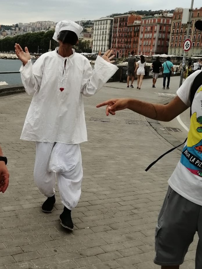 Lors d’un de mes rares voyages en train, je suis arrivé à la Gare Centrale. Ici, à l’extrémité d’une grande place, se trouve la statue monumentale de Giuseppe Garibaldi. Après quelques photos du héros des deux mondes, j’ai pris le bus en direction de Mergellina. Descendu à l’arrêt Piedigrotta, j’ai traversé la belle place Sanazzaro avec en son centre la Fontaine de la Sirène Parthénope, ancien nom grec de la ville. De là, je me suis dirigé vers le port où commence la promenade du Lungomare Caracciolo, la promenade la plus célèbre de Naples ; célèbre et pittoresque, où l’on peut rencontrer des personnages amusants comme le masque de Pulcinella.