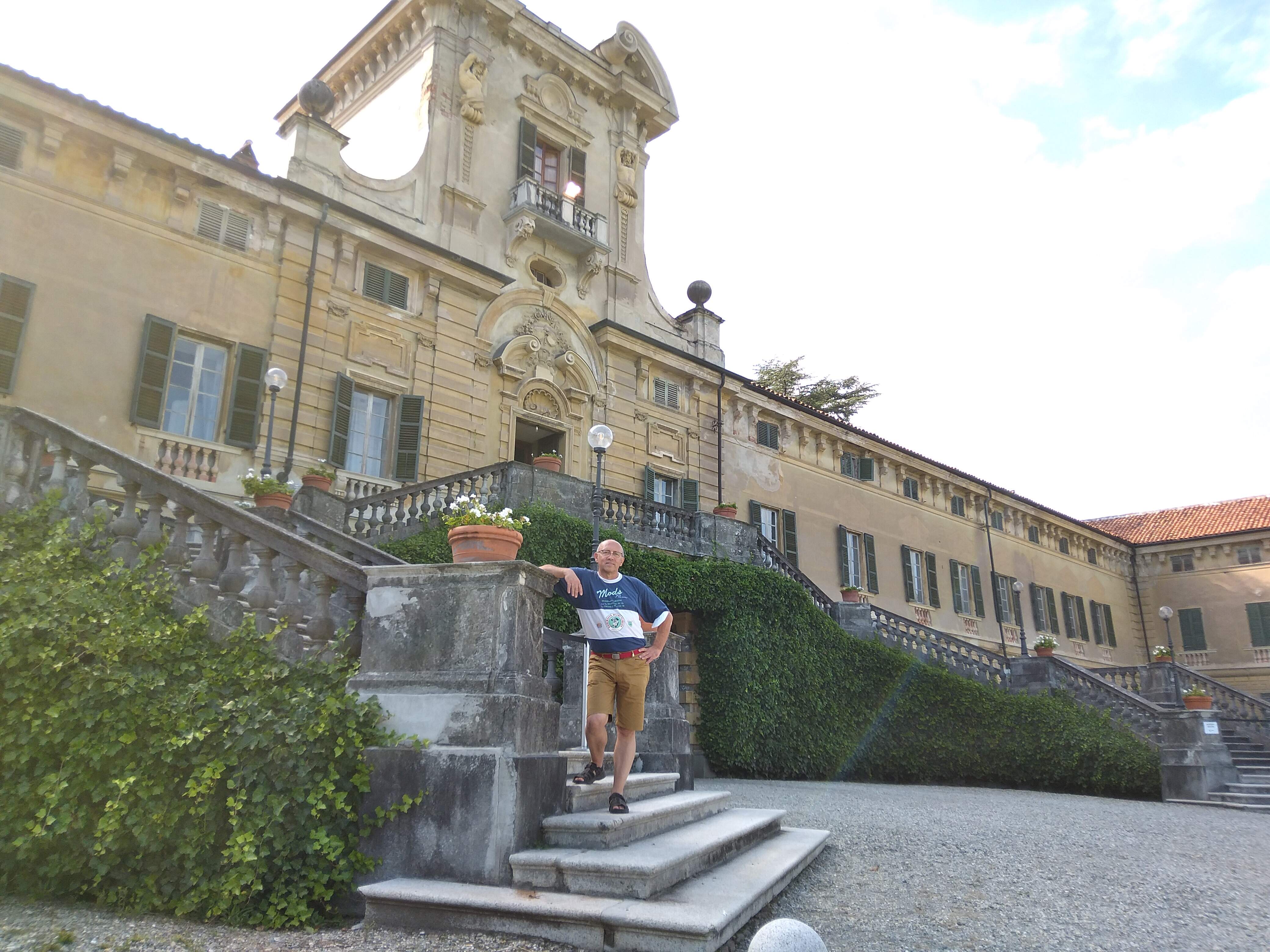 Un autre dimanche dans le Canavese, direction Rivara, charmant village à 35 km d’Ivrea. Tous les restaurants du coin sont complets, je choisis donc de déjeuner dans la proche Busano, où m’attend un repas copieux à un prix modique ; une liqueur de myrte gentiment offerte par l’aubergiste m’aidera à digérer, tout comme la prochaine montée au château. Après avoir franchi le torrent Viana, j’entre dans le bourg de Rivara. La visite commence par le grand parc de la Villa Ogliani : à peine passé l’entrée, j’embrasse un très haut séquoia de Californie, couvrant tout au plus un cinquième de sa circonférence ; de nombreuses autres espèces d’arbres sont également dotées de pupitres avec des explications détaillées. Aux abords du parc se trouve la Villa Ogliani, prestigieux édifice de style Liberty, aujourd’hui siège de la mairie. Une promenade à travers les rues du village et après seulement dix minutes, je me retrouve devant le massif portail gris aux pointes dorées du château de Rivara ; j’entre dans le grand parc à la pelouse à l’anglaise et aux arbustes taillés de façon décorative. Devant mes yeux, une magnifique et immense villa de style baroque ; n’ayant pas le pass sanitaire indispensable pour accéder aux espaces intérieurs, je jette un coup d’œil aussi loin que l’œil humain d’abord, puis l’appareil photo, peut aller. Derrière la Villa, séparé d’une dizaine de mètres, le château médiéval. Alors que je me dirige vers la sortie, les derniers rayons du soleil illuminent la façade ocre de la villa que Napoléon offrit il y a deux siècles à l’un de ses généraux, mais qui, aujourd’hui revenue à la patrie, peut être admirée de tous.