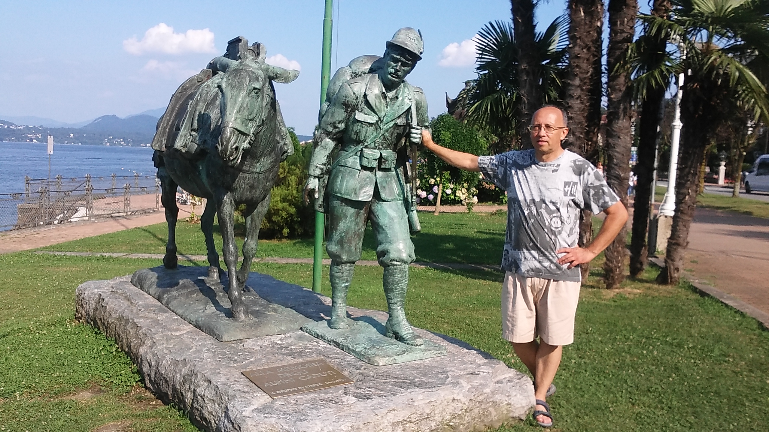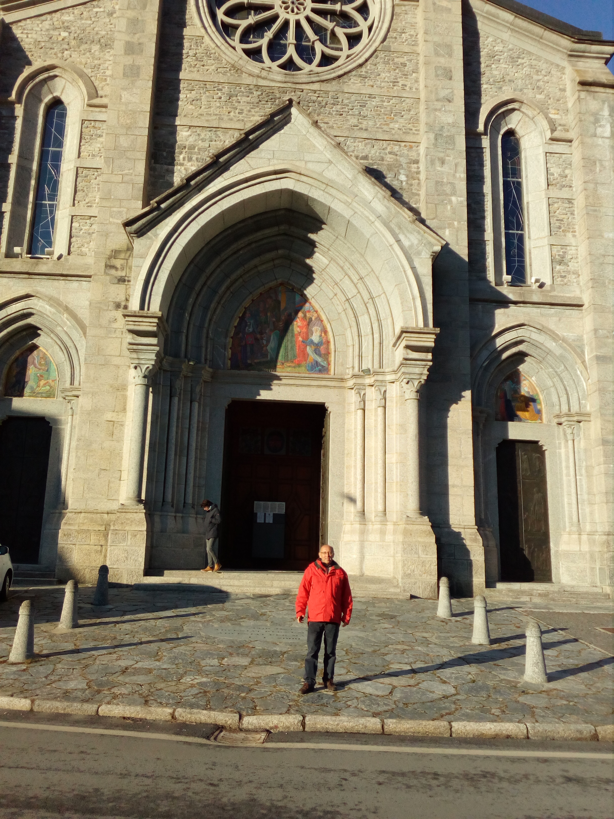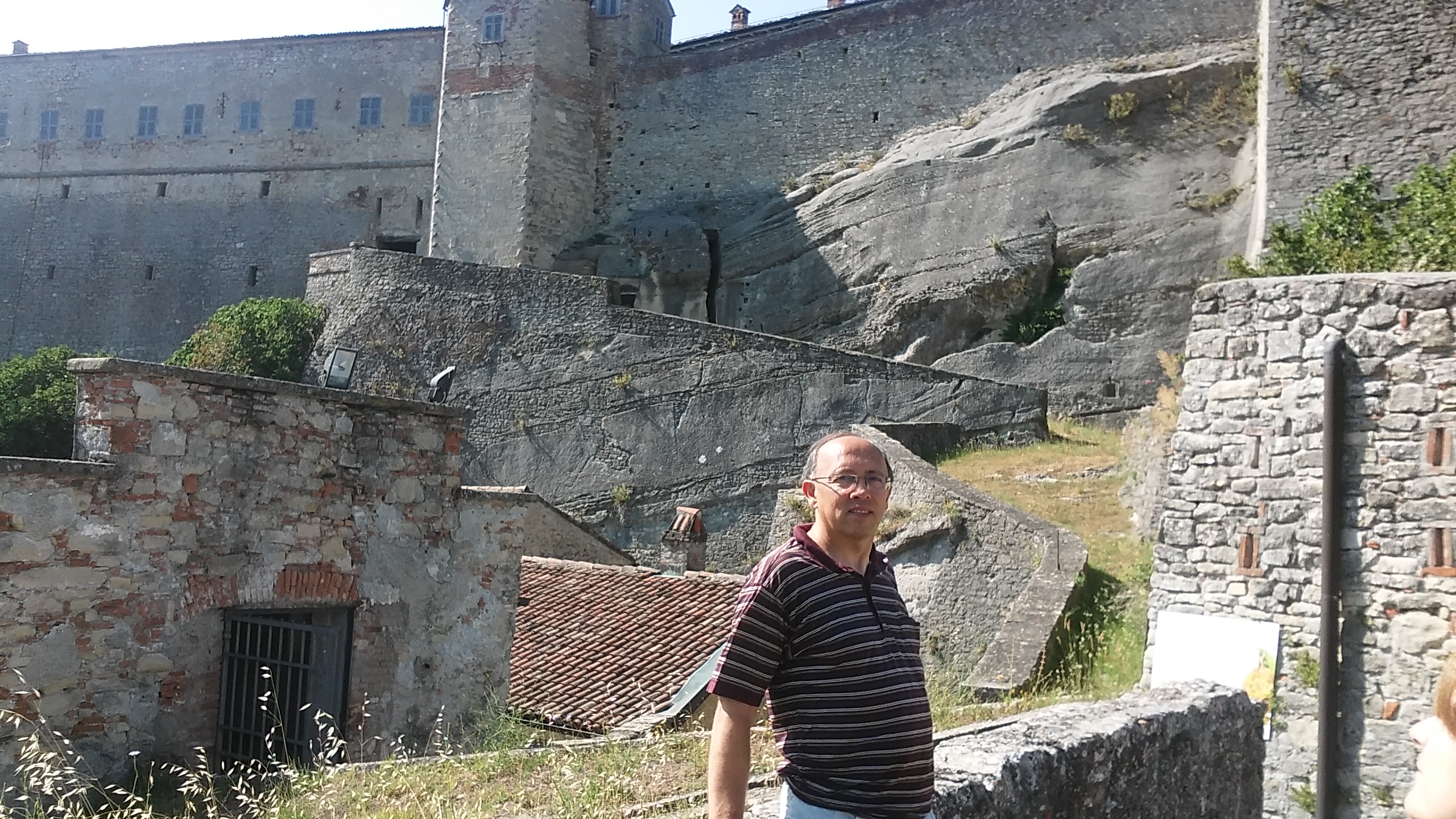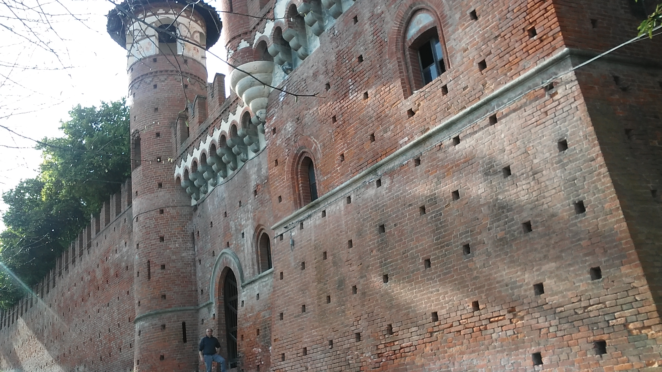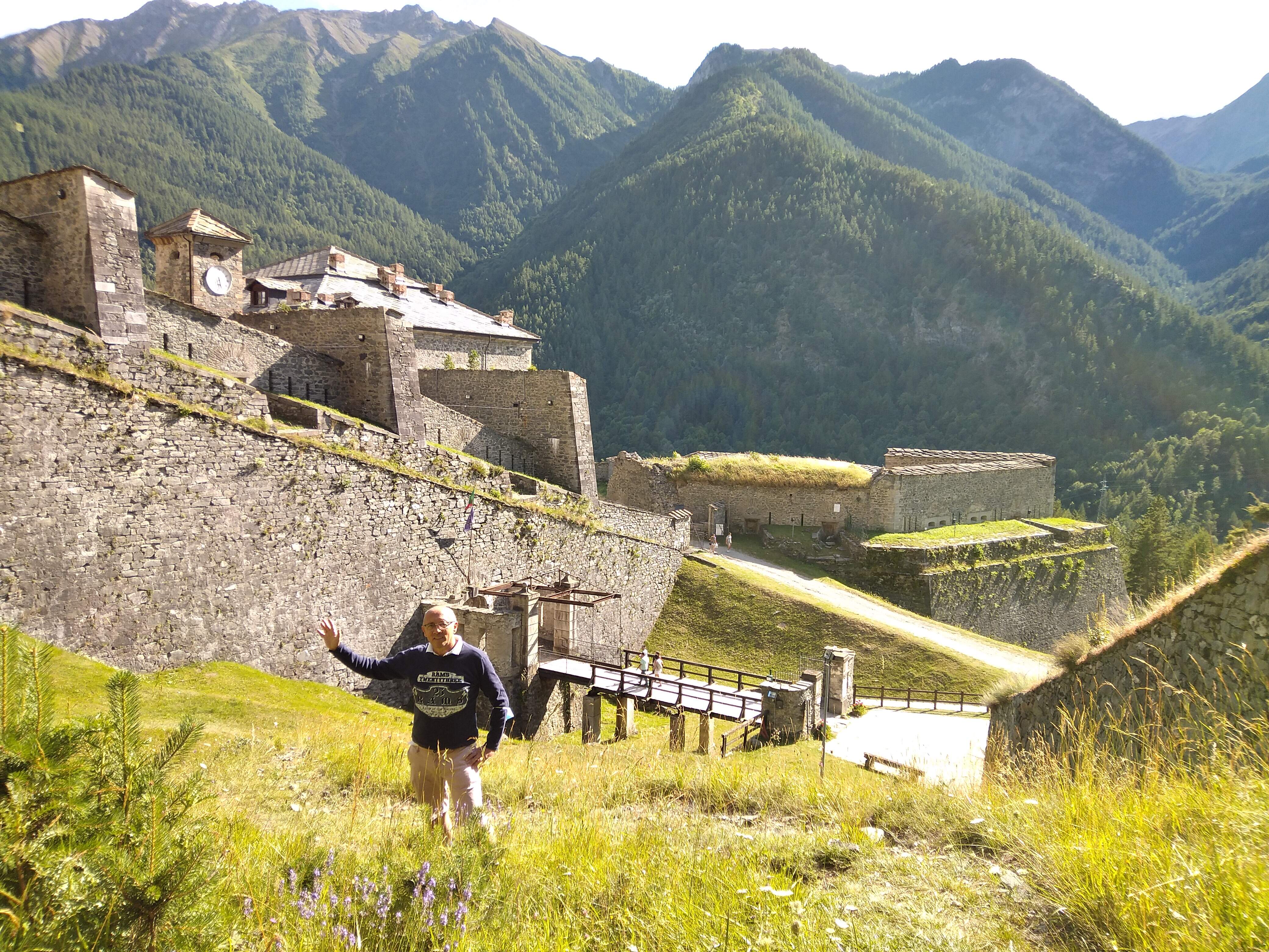 Enfin, après l'avoir tant désiré, un dimanche j'ai visité cette forteresse. Après avoir payé cinq euros pour le billet, comprenant la visite guidée d'une heure du Fort San Carlo. Rendez-vous du groupe dans la grande cour en face du Palais du Commandement qui, ces jours-ci, accueillait le Salon du Livre. Le Fort a été construit par les Italiens sur l'ancienne frontière entre la France et le Duché de Savoie dans une optique anti-française. Nous entrons dans le bâtiment qui abrite le Commandement de l'Institut Militaire de Correction ; aux étages supérieurs logeaient les officiers, tandis qu'au rez-de-chaussée se trouvaient les cellules de personnages influents de l'époque, dont la prison du Cardinal. Nous descendons dans les sous-sols pour visiter les cuisines ; suspendus au plafond, il y a des instruments où l'on gardait le pain pour le protéger des rats. Sortis dans la cour, nous entrons dans l'Église qui a subi de nombreux dégâts pendant la Seconde Guerre mondiale ; détail intéressant, le clocher était situé à une centaine de mètres, placé sur l'enceinte pour ne pas donner à l'ennemi des cibles à canonner à l'intérieur de la cour. Pour finir, nous entrons dans un tunnel souterrain composé de 4000 marches, qui mène après plus de deux kilomètres au sommet de la forteresse ; nous le parcourons brièvement. La visite guidée terminée, je m'engage sur la pente qui longe les puissants murs épais de trois mètres ; de ce point de vue, je peux mieux admirer le fort dans toute son étendue ; en arrière-plan, les magnifiques montagnes vertes de la Val Chisone.