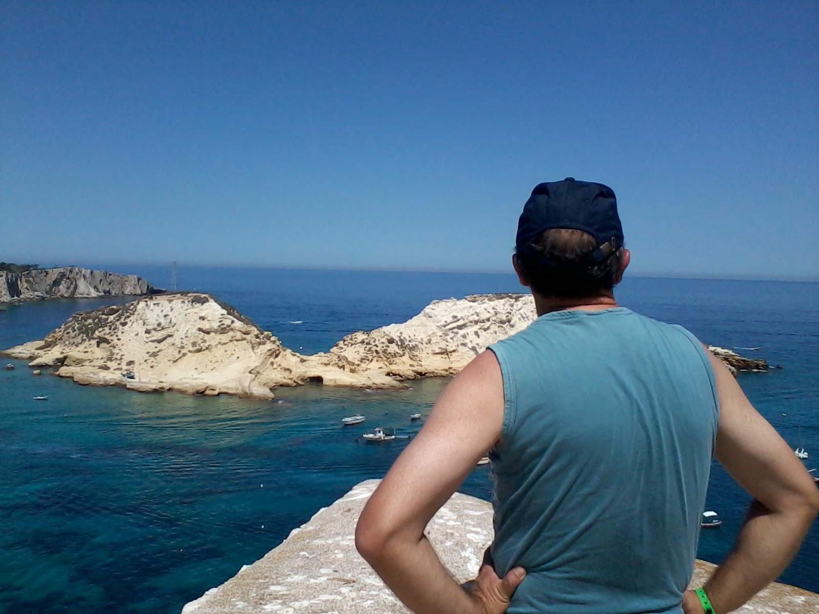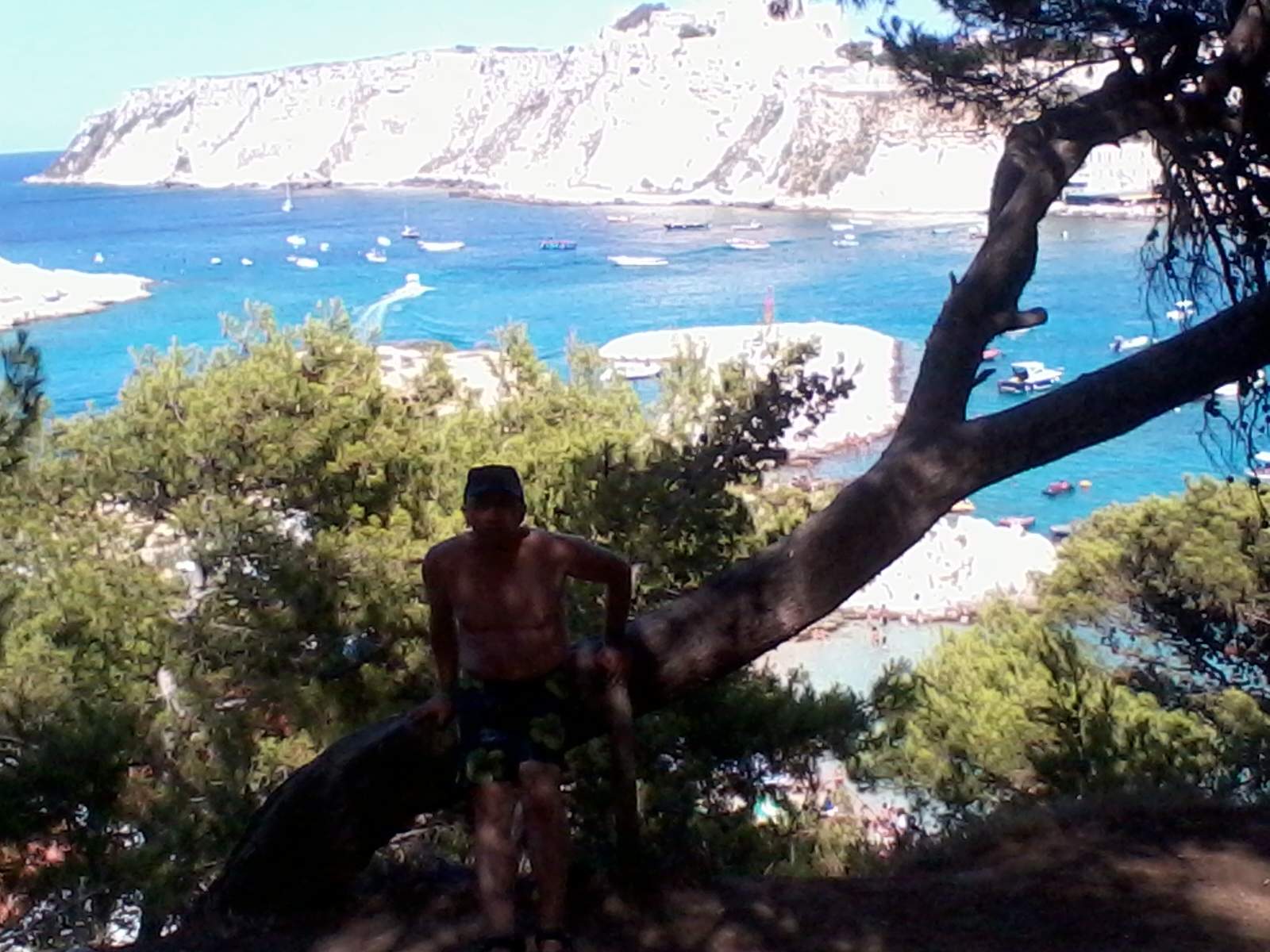 La visite de San Domino commence par le tour de l’île. La mer, en cette claire journée d’été, est d’un bleu pastel. Nous commençons par apercevoir le Rocher de l’Éléphant, un énorme rocher aux allures de pachyderme avec la trompe dans l’eau. Nous poursuivons avec la visite des grottes marines : la première est la Grotte des Violettes ; puis on passe à la Grotte du Bœuf Marin ainsi nommée car, dans un passé lointain, on y a aperçu quelques spécimens de phoque moine, une espèce rare aujourd’hui présente seulement en Sardaigne ; la grotte fait environ 70 mètres de long, au fond de laquelle se trouve une petite plage accessible uniquement à la nage... l’eau y a une profondeur de quatre mètres, ce qui, vu mes faibles capacités de nageur, suffit à me dissuader de l’atteindre. L’embarcation s’arrête à un endroit où, sous l’eau, il y a une statue que les plus téméraires plongent admirer. De retour sur la terre ferme, je parcours à pied une route panoramique qui surplombe une mer aux multiples couleurs. Arrivé à la plage bondée de Cala delle Arene, je trouve un petit coin où poser mon sac à dos et je me baigne enfin dans l’eau transparente des îles Tremiti.